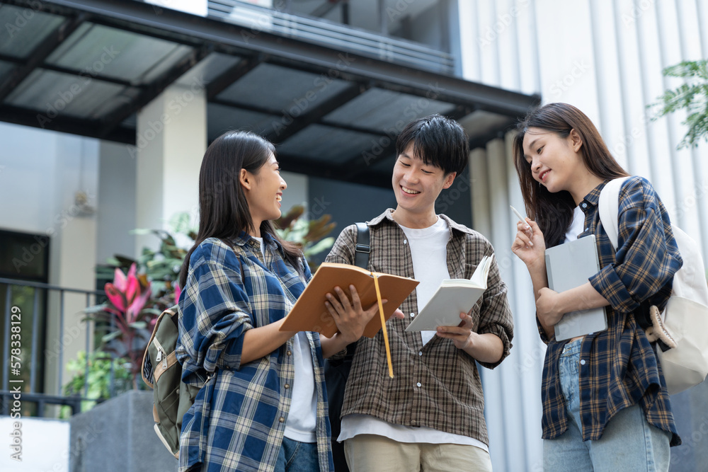 Group of happy young Asian students in casual clothes sitting on the front steps of a university building looking for educational information. teamwork classmate best friend.