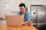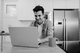 Handsome caucasian man working with a laptop computer at home kitchen drinking coffee and enjoying the morning. Happy young entrepreneur or student searching information on internet. Freelance work