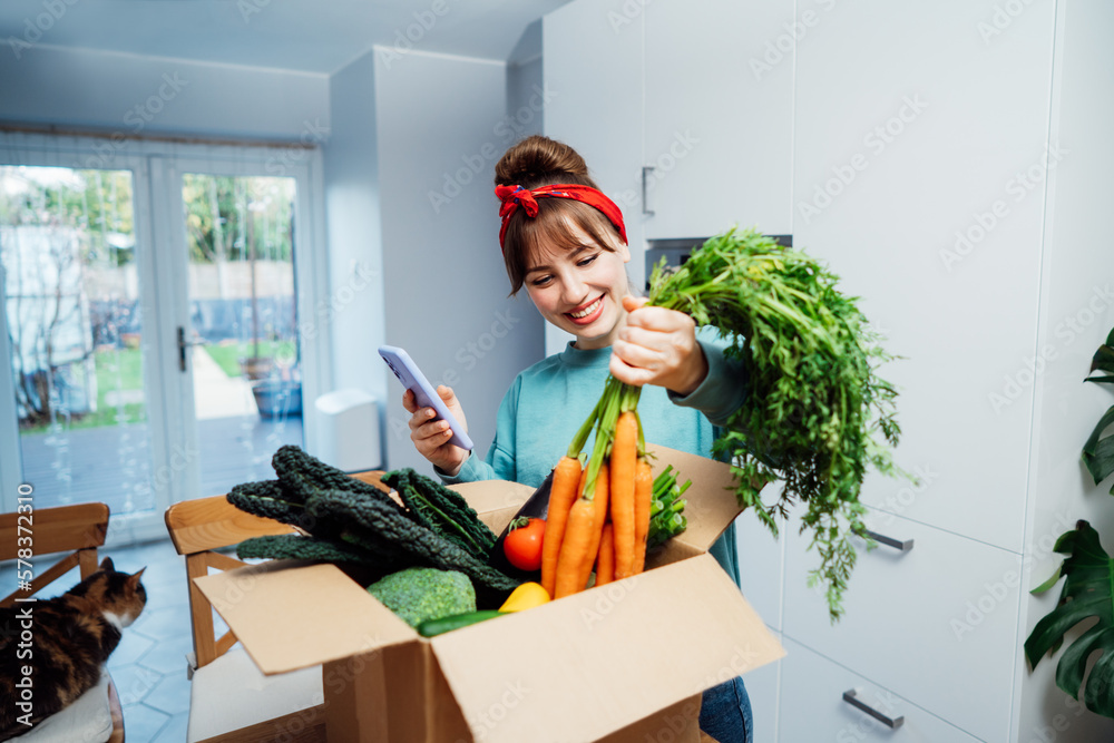 A young woman examines fresh organic carrots from her online food delivery. A cardboard box with fresh vegetables and fruits is on the kitchen table. Local farm food. The beginning of a healthy life