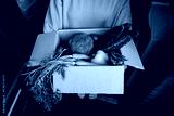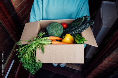 Home fresh food delivery. Woman holding cardboard box with vegetables and fruits. Support local farmer food production. New Start of a healthy life, weight loss concept. Online food order. Recipe box.