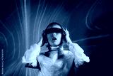 Portrait of sensitive dancing woman in futuristic sunglasses and headphones in pink and blue neon light. Music lover. Silent disco. Woman on the background of music vibes background. Futuristic Party.