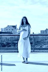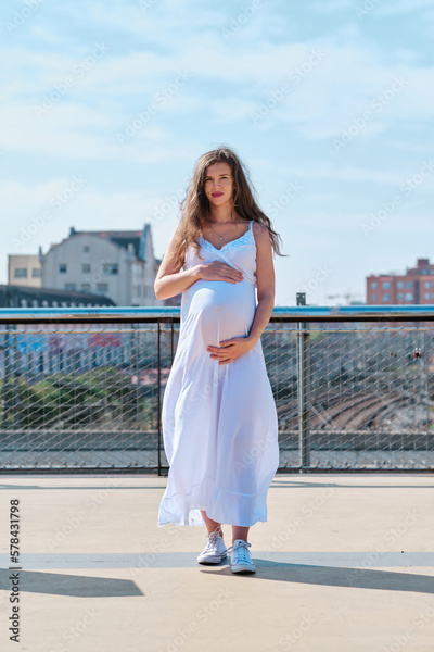Pregnant woman in white dress looking at camera while standing outdoors.