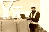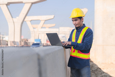 Construction Engineer using computer inspection on site highway road construction, Construction worker using laptop