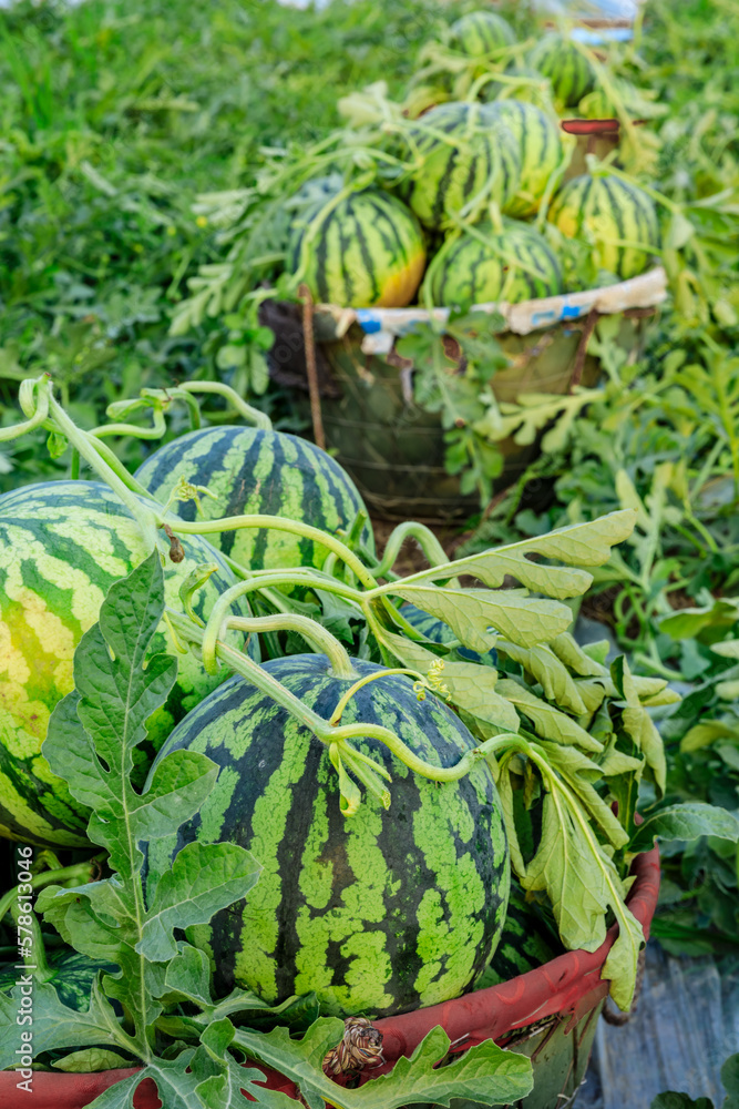 Fresh watermelon fruit just picked in the watermelon field. Agricultural watermelon field. Watermelon harvest season in summer.