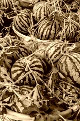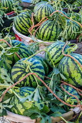 Fresh watermelon fruit just picked in the watermelon field. Agricultural watermelon field. Watermelon harvest season in summer.