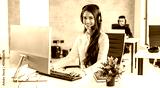 Beautiful young woman in headset working on computer and looking at camera. Telephone worker, helpdesk and customer support service concept.