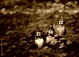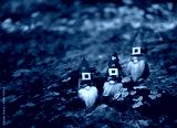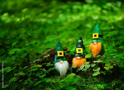 toy gnomes in forest, abstract green natural background. magic friends dwarfs in mystery nature. fairy tale image. spring, summer season. symbol of Ireland, St. Patrick day, traditional irish holiday