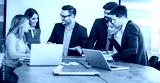 Corporate male business executive leader having discussion with employee staff about marketing discussion, planning strategy and sharing ideas at meeting in office.