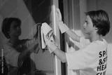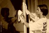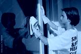 The guy, a teenager of thirteen, cleans the house, vacuums the floor, the sofa, the boy cleans up the house. A guy in blue mittens and beige clothes, a child washes windows, wipes the dust