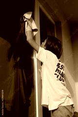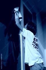The guy, a teenager of thirteen, cleans the house, vacuums the floor, the sofa, the boy cleans up the house. A guy in blue mittens and beige clothes, a child washes windows, wipes the dust
