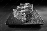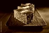Chocolate cake with walnuts and pistachio isolated on black background. Pastry from homemade bakery