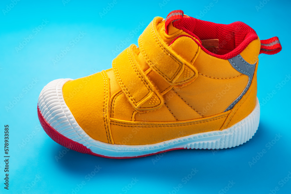 Yellow baby shoes. Kids sport sneakers isolated on blue background