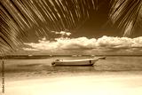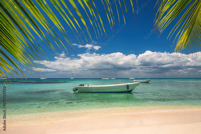 Caribbean sea and boat on the shore, beautiful panoramic view from the island beach