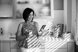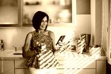 Adult woman using the mobile in the kitchen at home