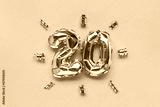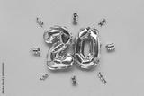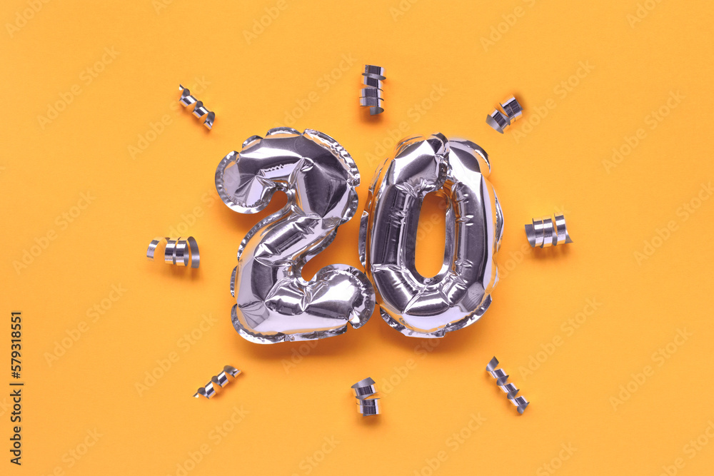 Number twenty silver balloons with ribbons confetti on a yellow background.
