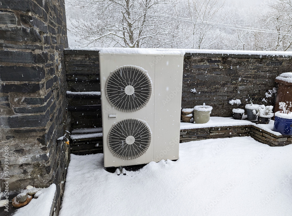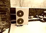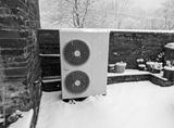 A snowy view of an outside unit for an air source heat pump.