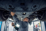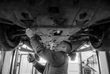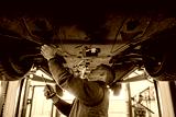 An auto mechanic is repairing car while standing under it at mechanic's shop.