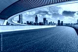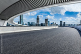 Asphalt road and pedestrian bridge with modern city skyline in Ningbo, Zhejiang Province, China.