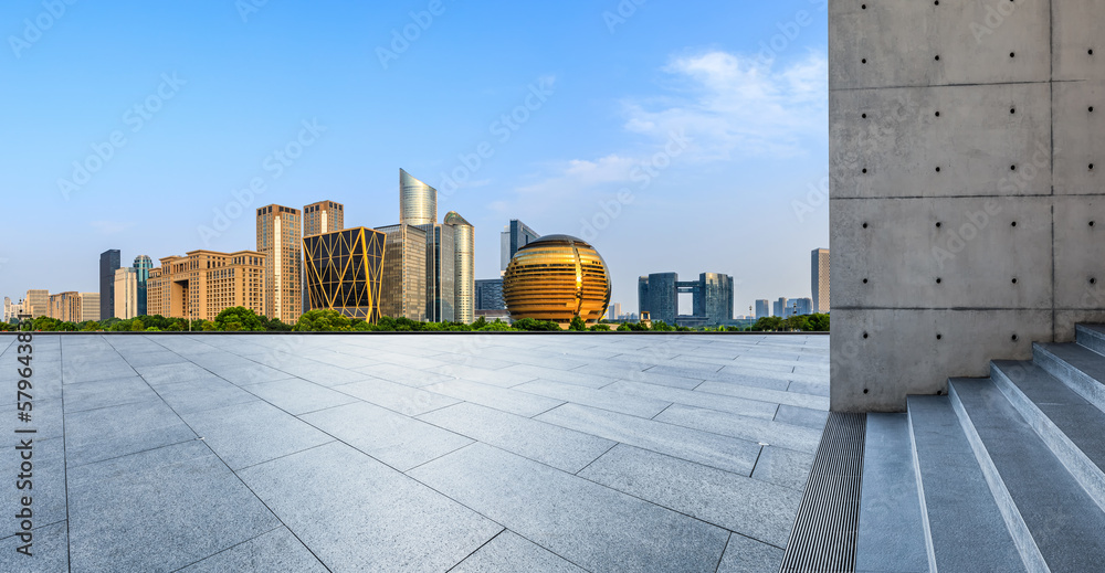 Empty floor and city skyline with modern building in Hangzhou, China. Panoramic view.