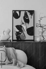 Modern composition of living room interior with mock up poster frame, wooden sideboard, glass vase with branch, sculpture, white sofa, beige plaid and personal accessories. Home decor. Template.