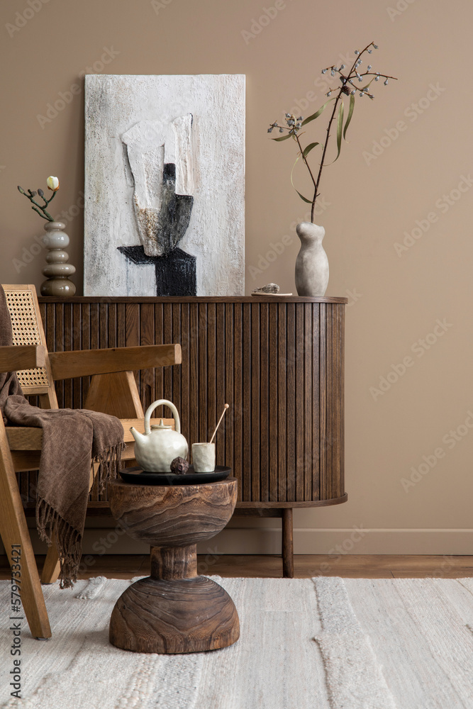 Cozy composition of living room interior with mock up poster frame, wooden sideboard, rattan armchair, round coffee table, vase with branch, beige rug and personal accessories. Home decor. Template.