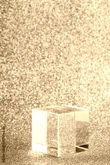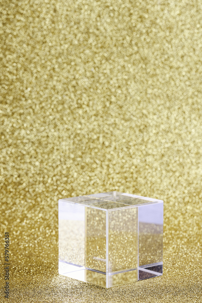 transparent podium for product display on yellow glittering background. pedestal, stage for product. copy space. selective focus