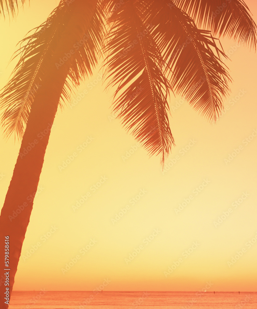 silhouette of tropical palm trees and ocean sunset