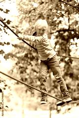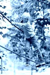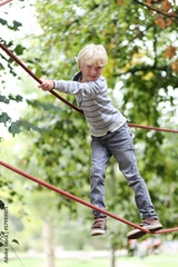 Sportive teenager boy climbs on the ropes at playground