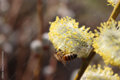 Close-up of Honey bee on Goat willow flowers. Apis mellifera on Salix caprea tree in bloom