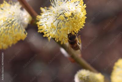 Close-up of Honey bee on Goat willow flowers. Apis mellifera on Salix caprea tree in bloom