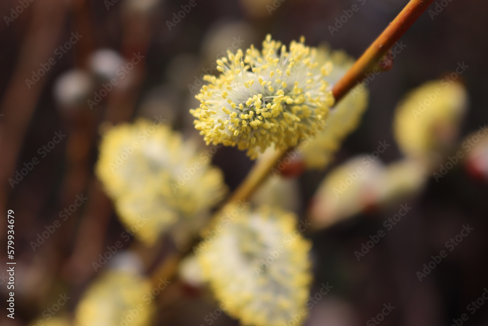 Close-up of Goat Willow or Salix caprea tree with yellow flowers on early springtime