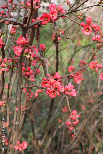 Cydonia or Chaenomeles japonica bush withl pink flowers. Japanese quince in bloom