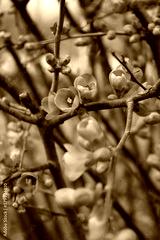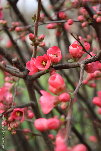 Cydonia or Chaenomeles japonica bush withl pink flowers. Japanese quince in bloom