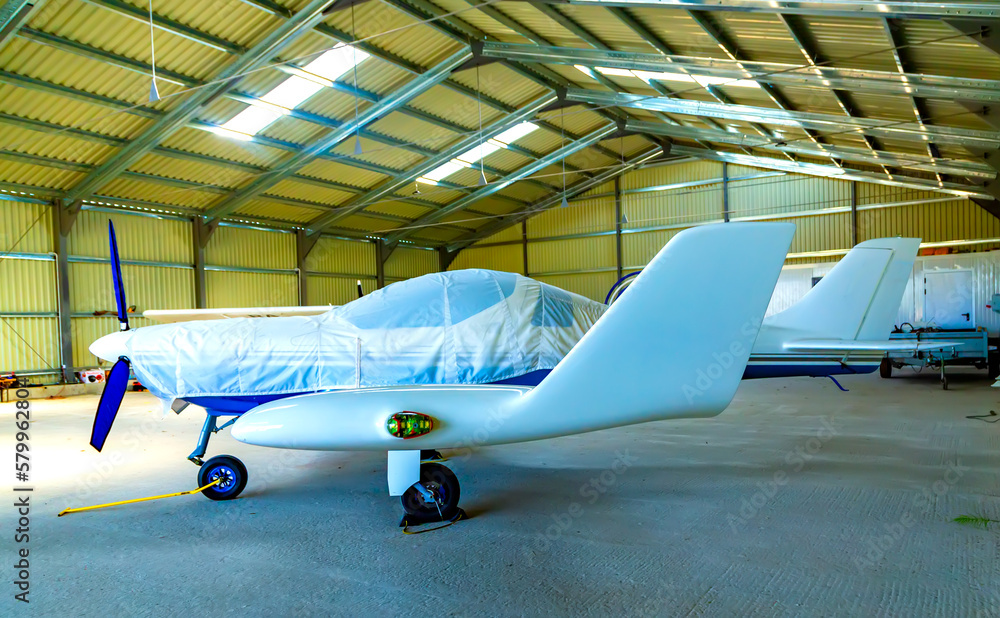 small plane with athree bladed propeller of private aviation is covered with cover in bright hangar while preparations for launch are underway and propeller is in cover