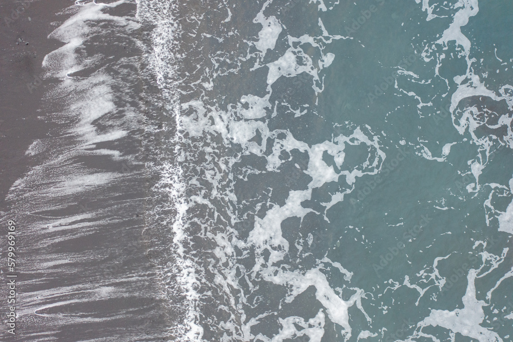 Great view of a beach with big turquoise waves crashing down from a bird's eye view.