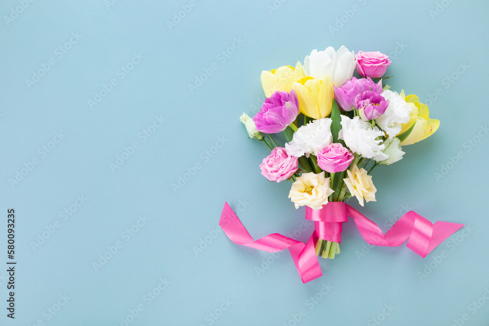 Bouquet of beautiful spring flowers with pink ribbon on pastel blue table for Happy mothers day. Flat lay.