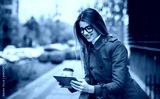 Businesswoman drinking coffee and searching internet with tablet in front of the office. Business, lifestyle concept