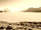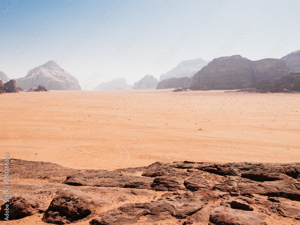 Landmarks of the Wadi Rum desert in Jordan. Clear, sunny day. No people. Vacation and travel concept
