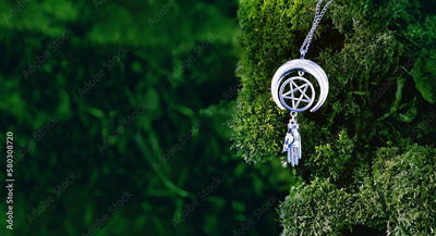 amulet with pentagram on moss, abstract natural dark forest background. spiritual ritual. witchcraft, pagan traditions, wiccan practice. esoteric symbol of pentacle and hand. copy space