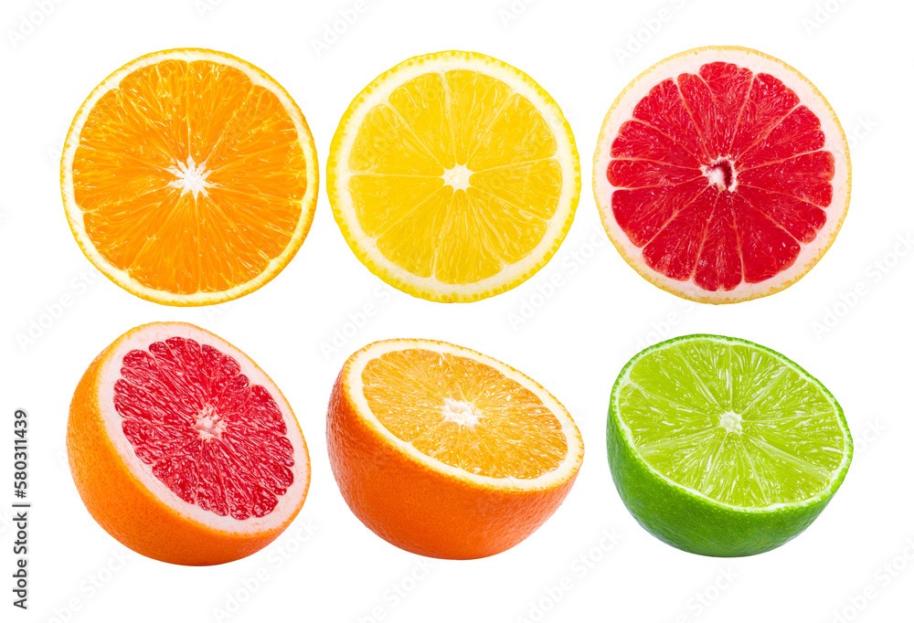 Ripe half of pink grapefruit citrus fruit orange lime slice isolated on transparent png