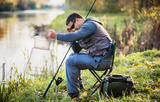 No fish today. Disappointed fisherman looking at empty metal wire keeper net. Sport and recreation concept