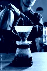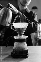 Pour over filter coffee alternative brewing method. Barista is pouring hot water over roasted and ground coffee beans contained in paper filter.
