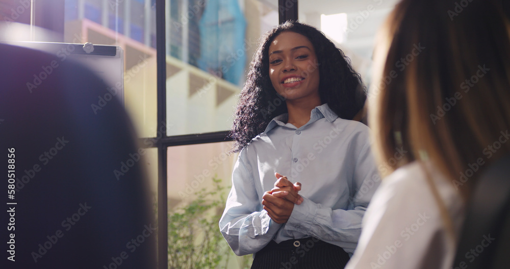 Confident young businesswoman or speaker sharing ideas with colleagues or audience during company seminar.