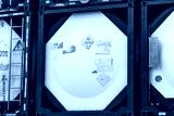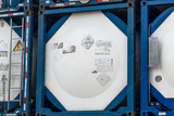 Chemical tank container. ISO tank container for chemical delivery. Bulk liquid transport. Chemical company. Container freight area. Global logistics business. Chemical container for truck transport.