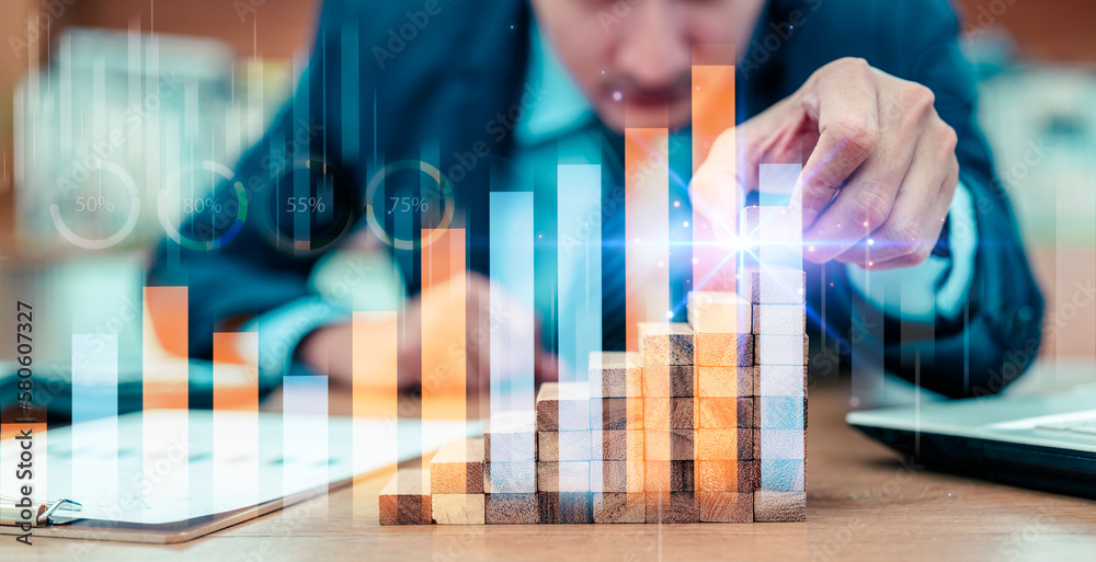 Businessman hand putting placing wood block on the tower and semi-pyramid in modern office. Plan business development ideas, investment graph and strategy in business concepts.