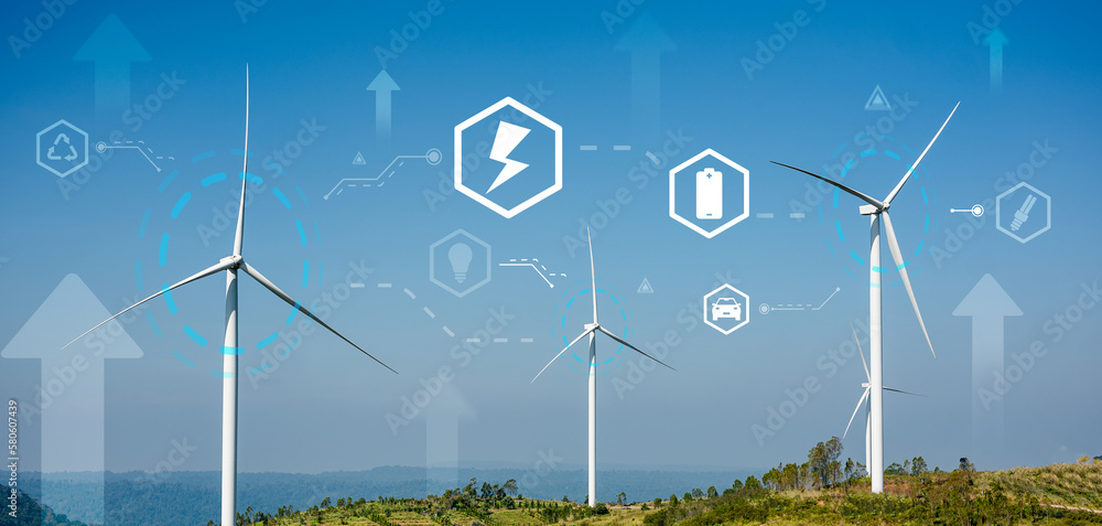 Wind turbine, windmill in mountain landscape with graphic interface. Wind turbine, windmill is located on the blue sky mountain. windmill, wind turbine, innovation, electricity, resource, environment.