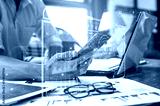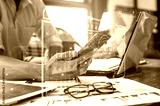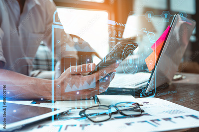 Businessman sitting at table and working and using smartphone looking for graphs and stocks of investments.Concept Innovation, inspiration, creative solution idea for modern business intelligence