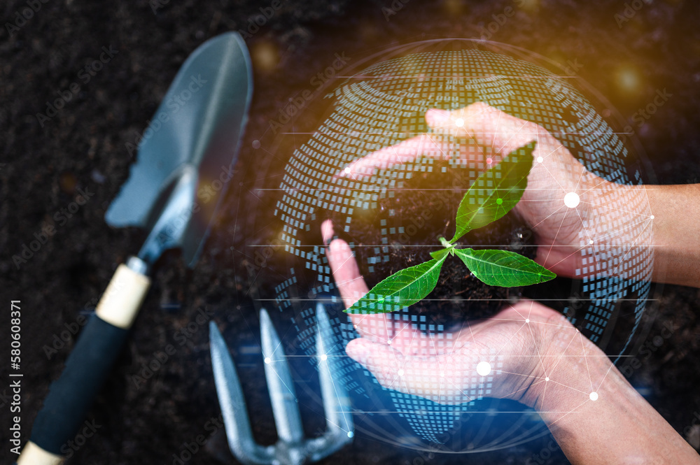 Front of Planting seedlings with two hands, potholes, shoveling, seedlings grow from fertile soil until the morning sun shines, planting trees to save the world, ecological conservation concept.