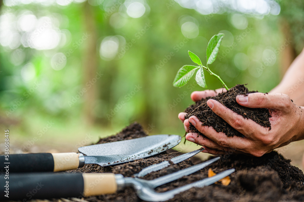 Hand holding green plant with icons energy sources for renewable,plant growth, sustainable development. Ecology concept.
