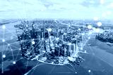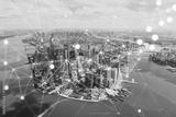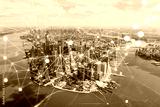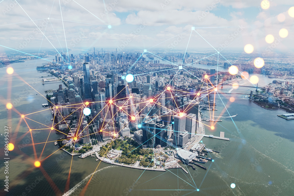 Aerial panoramic helicopter city view on Lower Manhattan district and financial Downtown, New York, USA. Social media hologram. Concept of networking and establishing new people connections